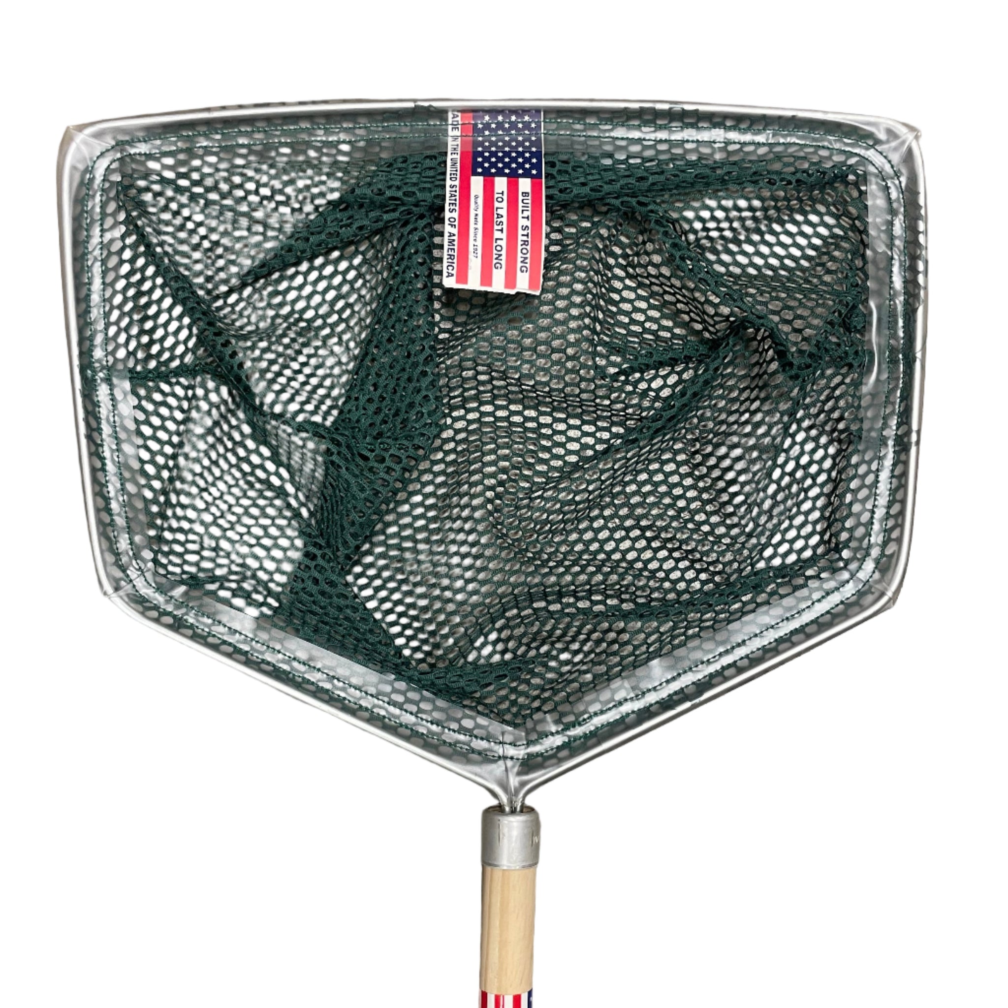 All wood handle with heavy-duty galvanized steel frame. All mesh is knotless green nylon. Replacement bags are not available for these nets.  16" x 12" Frame, 7" Deep Bag, 42" Wooden Handle, 1/4" Green Mesh. This net does not have the steel net guard that comes on the DN26