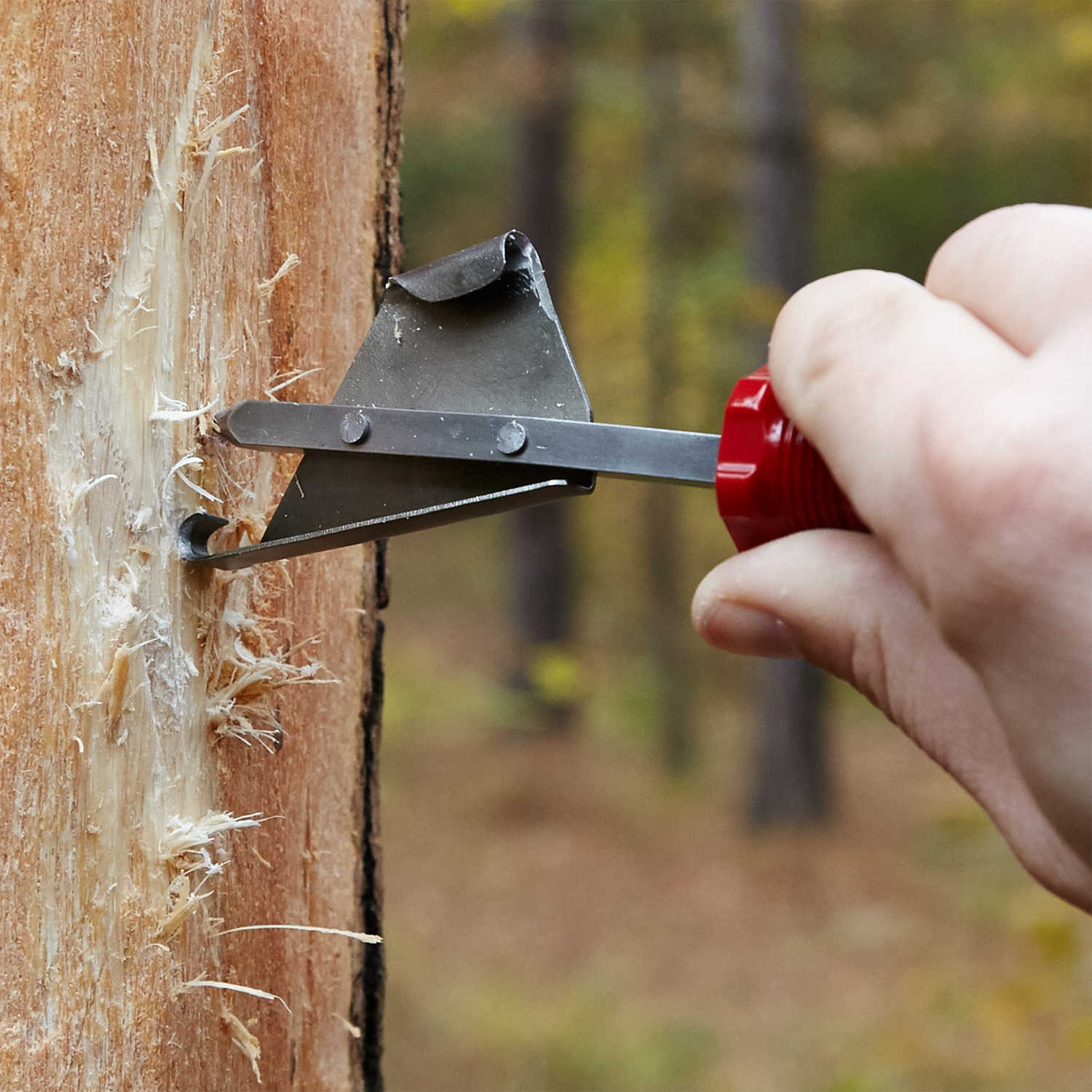 Designed and manufactured by a professional surveyor! Features a double edged cutting blade that forms a 5/8” radius for right or left hand curved letter and number cuts, as well as an additional cutting edge for straight lines. And, there is no need for allen wrench adjustments to modify the tool to make these cuts! The steel cutter has been mildly tempered to maintain an edge while allowing for easy sharpening with a 5/32” chain saw file (included). Also includes a leather holster that can be worn on your belt.